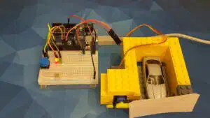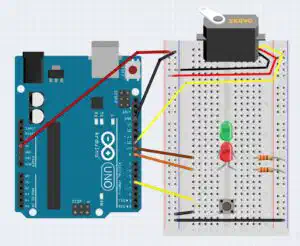 This project features a Pushbutton, 2 LED’s and a Servo motor. The Red LED starts on. When the button is pressed, the servo motor rotates to lift the garage door, and the LED’s switch from Red to Green. After a short pause, the door closes and the LED’s switch back.