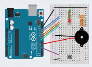 This project features a Pushbutton, Speaker and 6 LED’s. LED’s have 330 ohm resistors connected in series to limit the current, but you could get away with anything up to 1kOhm without any issues. When the push button is pressed, the buzzer will play through a sequence of notes.
