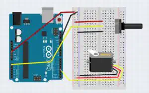 This project features a rotary Potentiometer and a Servo motor. As the potentiometer is turned, it creates a variable voltage that is then read by an Analog pins on the Arduino. When the AnalogRead function is called, it will give a range of 0 – 1023 depending on how far it has been turned. The Servo motor requires a control value of between 0 – 180. We use the map() function to do the maths required to make the change.