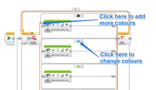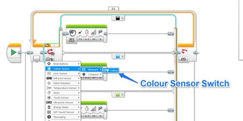 The programming was done in EV3-G and very straight forward.  A single loop checks the Colour Sensor connected to Port 1 via a Switch Block.  I added multiple conditions to the switch so that there was one for each colour LEGO brick I had available (huge thanks to Filippa from LEGO for the coloured beams!).