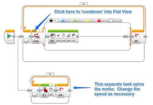 A separate task spins the motor (connected to Port A).  Change the speed as necessary to speed up or slowdown your sequencer.