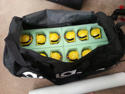 I was sick of my BeeBots rattling around in one of my bags, and the only ‘official’ storage I could find held only 6 BeeBots.  A quick trip to the local foam shop and I got a few pieces custom cut to fit a spare bag of mine.  A little Tetris with a template to make sure they fit in, and then careful cutting with a very sharp knife.