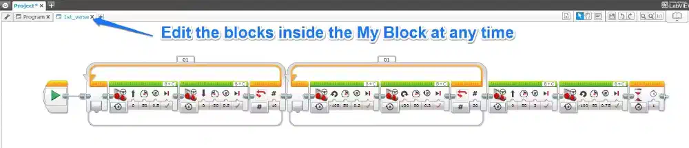 You’ll now see all those blocks have disappeared and have been replaced by a single My Block that you have just created. If you want to edit anything inside this My Block, double click on the block and it will open up a separate Program within your Project with just the blocks associated with the My Block.