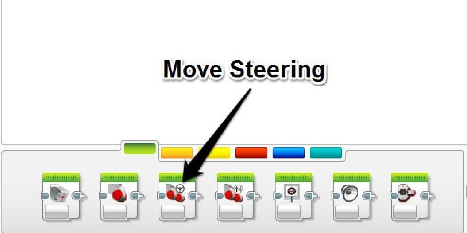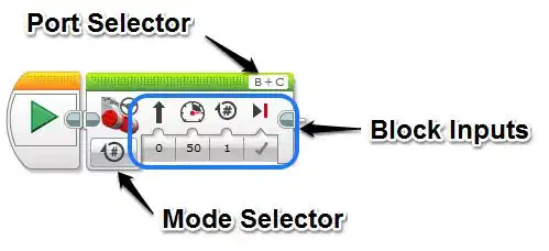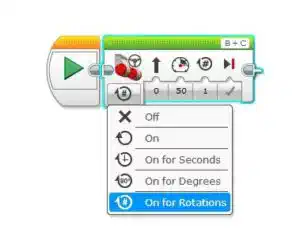 The Move Steering Block has 5 different Modes, OFF, ON, On for Seconds, On for Degrees and On for Rotations. Each of these modes do the same essential thing, move the wheels, but allow you to choose how they will be moved. The Block Inputs then allow you to fine tune the movement.