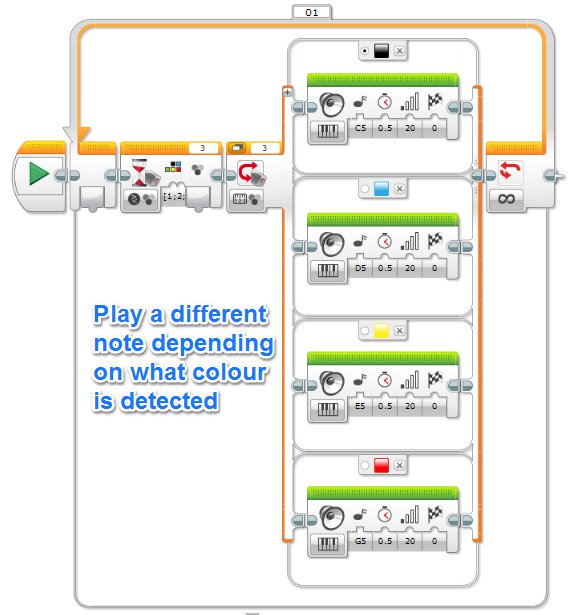- Music Maker. This design only needs a Colour Sensor being used in ‘Colour’ mode. An extended Switch statement identifies which colour is under the sensor and then plays the appropriate note.