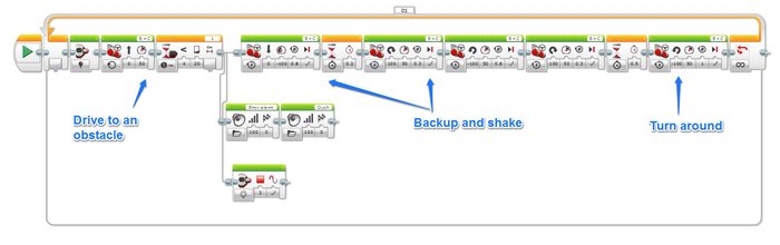 - Obstacle Avoider. Using the Ultrasonic Sensor, this robot backs up when it gets close to an object. I put in an extra little ‘back up and shake’ routine as well as a sound effect to give it a little more personality.