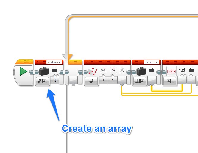 We then generate a random number between 1-4 (I’m only using 4 colours at the moment). This random number is appended to the Array. As there is nothing yet in our array, this means it will be put in at array index 1. (NB. Arrays in EV3-G are numbered from 1, which is different other programming languages with often begin numbering at 0. There were long and intense debates around the reasoning for this which I won’t get into!).