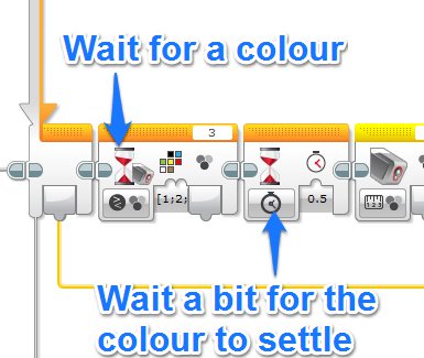 Firstly it waits for a colour to be detected. Any colour will do, just so long as it is not ‘no colour’. It then waits for half a second to make sure the colour paddle has settled into place. This is needed to make sure the colour sensor doesn’t pick up a bunch of random colours as the paddle comes down over the top.
