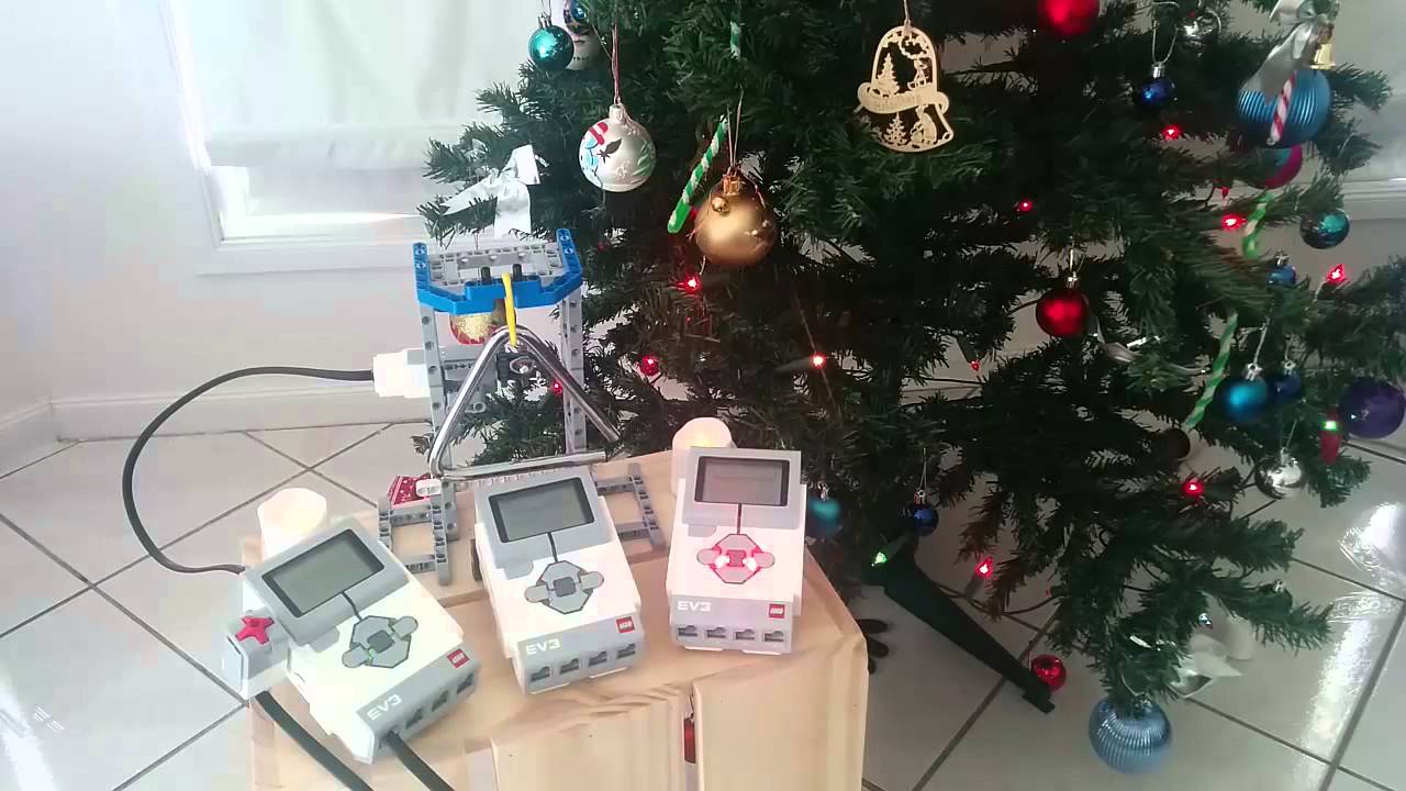 Here is my LEGO MINDSTORMS EV3 version of ‘Carol of the Bells’. I found a version of the song in 3 parts and assigned each voice to an EV3. Timing was particularly difficult as while the notes played as expected, things like Loop and Bluetooth functions all take a finite time, which can throw out the timing of the song. In the end I sent a bluetooth message from the Master EV3 (left hand one) to the two Slaves ever 4 bars of the song. It does a pretty good job of keeping it roughly in time.