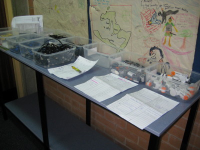 The NXT bricks, motors, sensors etc are kept in smaller plastic containers, again without lids so that they stack inside each other (see 4). These pieces are numbered and the boys sign for them as they take them (see 5).
