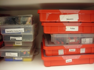 The bins are all stored in a cabinet (huge). Some oversized robots (those do not fit in the bin) are stored on top of the cabinet so that no one can touch during the school period.