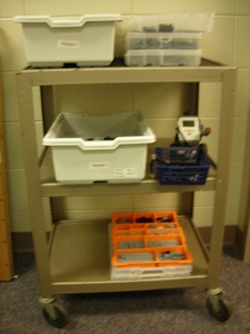 I keep most of the parts in storage closets, but do have NXT parts that we use frequently on a rolling cart.