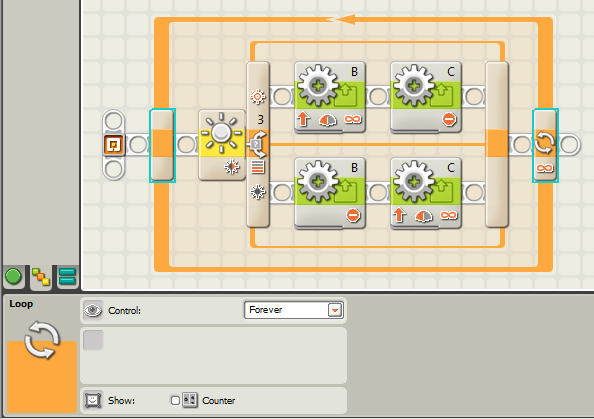 Using the very basic line following program shown below, the robot will turn left to see the line and then right to avoid the line. Repeat this forever and the robot will ‘wiggle’ its way down the line.