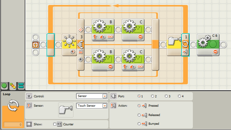 In a Teacher workshop this week we were looking at ways of following a line. In these workshops I stick with a simple ‘wiggle’ algorithm just using a Switch statement and some Move Blocks. The group picked it up quickly and we had a little bit of time left at the end, so naturally the question arose, “How do we make it stop at the end?”