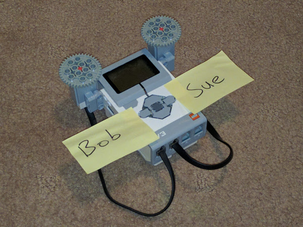 There are three parallel tasks; Task 1 sets up a variable (Bob) and makes sure it is zero when the program starts. It then runs an unlimited loop in which it waits for a touch sensor to be ‘bumped’ (pressed and released). It then takes that variable and adds one to it and stores the number back into the variable. Task 2 does exactly the same thing for a different variable (Sue). Task 3 takes the Bob variable and combines it with some text so that the display says ‘Bob: 7″ as opposed to just the number by itself. It then displays that Text on the screen at position 0,0 (Top left). It then does the same thing with the Sue variable and puts it at position 0,3 (Middle left roughly). The important thing to note is that this second display block has the ‘Clear Screen’ input parameter set to FALSE to make sure that we don’t clear out our Bob Text.